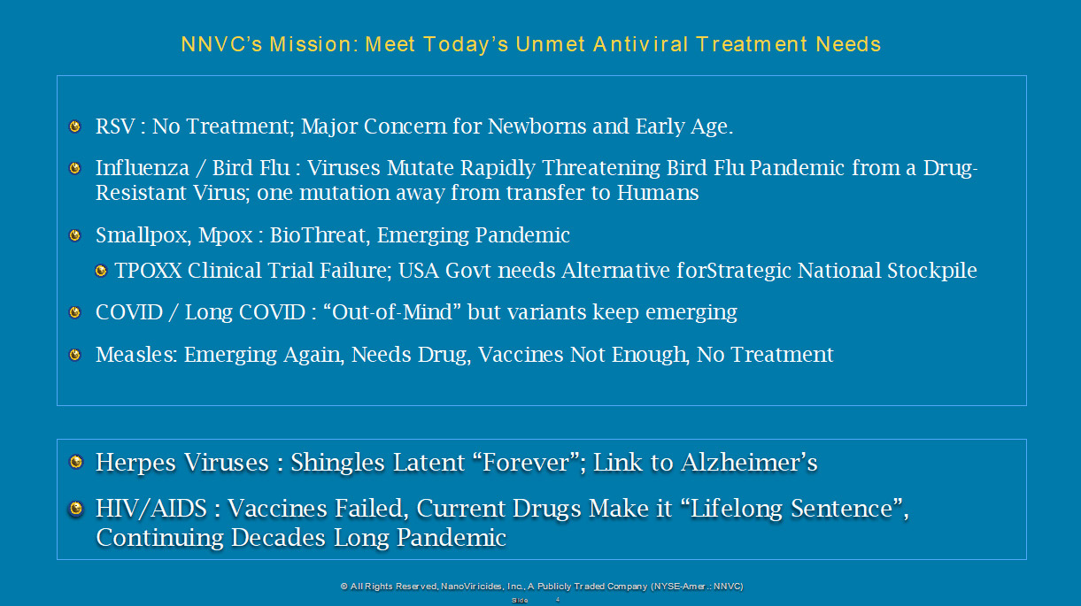 By addressing multiple high-impact viral diseases through a single technology platform, NanoViricides positions itself as a key player in global antiviral preparedness and innovation.