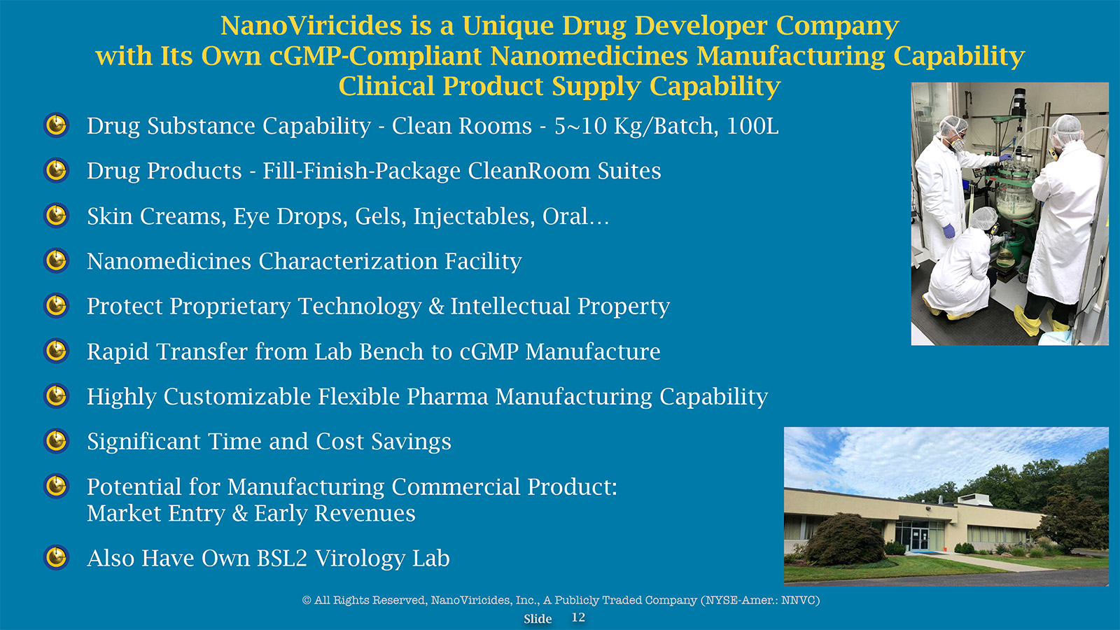 With a cGMP-compliant in-house manufacturing facility in Shelton, CT, NanoViricides can rapidly scale production from clinical to market supply, allowing faster commercialization.