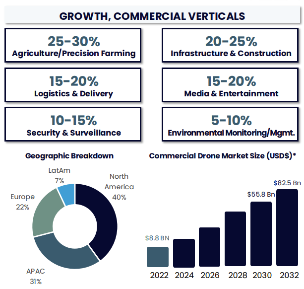 The commercial drone market, valued at $8.8 billion in 2022, expected to reach $82.5B by 2032 [vi]. The military drone sector adds further scale, growing from $14 billion in 2023, expected to reach $47 billion by 2032 [vi]
